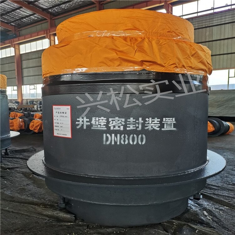 为了解决背景技术所存在的问题,本实用新型是采用以下技术方案它包含外套管、环板、外套密封波纹管、第二环板、内管密封波纹管、内管、第三环板和第四环板,外套管同轴套接在内管的一端外侧,且外套管的后端垂直设置有环板,外套管外侧同轴设置有井壁,且井壁与环板之间焊接有外套密封波纹管,外套密封波纹管后侧的内管外壁垂直焊接有第二环板,内管的另一端外壁垂直设置有第三环板,且第三环板的外缘与井壁的端部焊接,第三环板与第二环板之间设置有数节焊接固定的内管密封波纹管,第三环板后侧通过螺栓设置有第四环板。[所述的第三环板与第四环板之间设置有密封垫。本实用新型的原理为外套管与井壁之间通过外套密封波纹管连接,能够补偿外套管的轴向位移,消除外套管和井壁之间的应力,同时起到密封作用,隔绝地下水使其不会渗漏到井室内。在内管相对于外护管运动时,内管密封波纹管属于弹性元件,补偿了内管的位移量,同时起到了密封作用。本实用新型设计科学合理,消除了外套管和井壁之间应力的同时又起到密封作用,隔绝了地下水,使其不易渗漏到井室内,且水或者湿气不易进入保温棉内,保护了井壁和井室内管件的安全,延长了使用寿命。