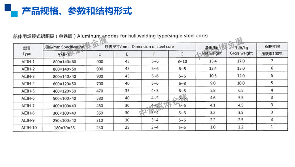 我公司也可以根据客户的不同需求设计并出产各种特殊规格和机能的铝合金牺牲阳极。