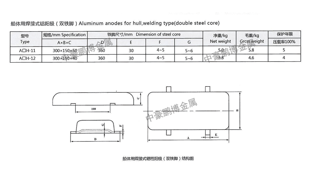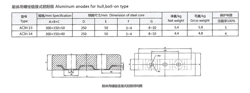 铝阳极能够防止海水及淡水中钢质结构的腐蚀,适用于海水介质中的船舶、机械设备、海洋工程和海港设施以及海水管道、船体、压水舱、储罐、钻井平台、海泥中管 道、电缆等设施金属防腐蚀的阴极保护。铝阳极的性能受合金的化学成分影响,我们提供不同的合金组成, 以满足顾客的要求,我们也可以根据客户要求制造特殊规格化学成分的阳极。
