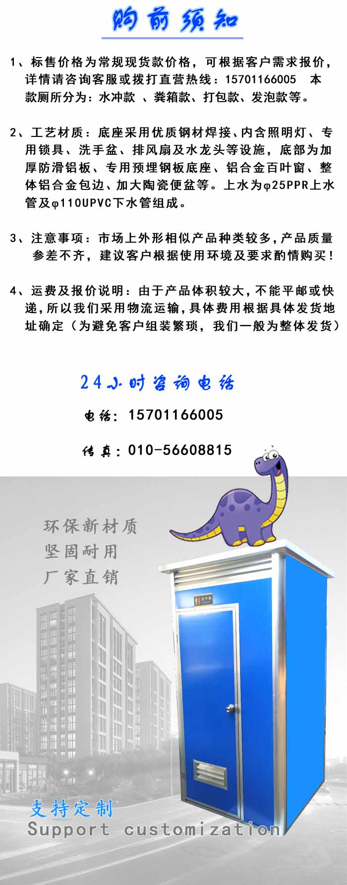 适用条件:1、上下水通道;储存箱储存定期抽排;2、在环境温度过低时采取必要的保温措施,我们针对北方的天气条件,每个产品都做保温措施,冬天不结冰不冻管,厕所可以正常使用;3、适用于城市街区、道路、广场等公共场所以及展会、运动场、建筑工地、集会现场、公园等临时场所