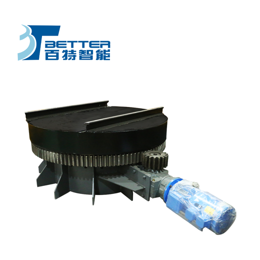 转盘是安装在基础地坑内,用于承载货物或行走设备在轨道上走行时的换向(转线)设备。原理:转运车运行至电动旋转平台上,手动或自动旋转电动旋转平台,与垂直轨道对接,使转运车可沿垂直轨道运行,实现90度转弯,适用于装备生产线的环形轨道、交叉轨道等场合。转盘系统运行平稳,轨道对接精度准确,也可实现全自动电器控制。转盘为圆形地坑式布置,本转盘盘面与地面齐平。