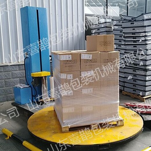 (预拉伸化工袋码托盘缠绕包装机),用人工将包装材料绕紧在托盘上, 该托盘缠绕包装机适用于托盘上堆放的物品的外包装 。