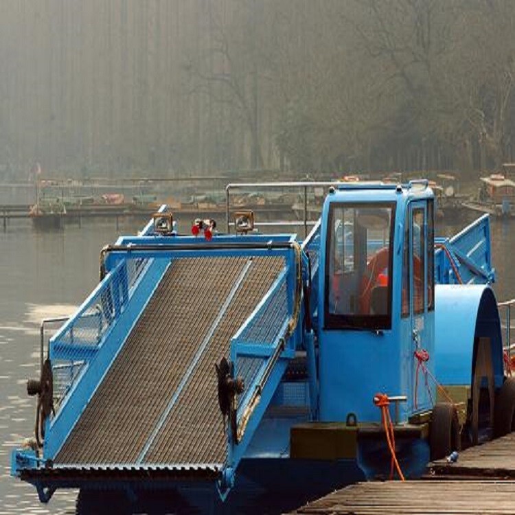 本船为单机、双明轮液压推进、全液压自动水面清洁船。本船前收集臂前置收割器,能切割水草等水生植物。收集舱经液压顶升装置,可自由上下动作,根据水深调节收集,并安装撞保护装置液压马达。中、后集物舱均采用不锈钢收集带输送,由液压马达驱动。