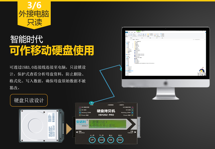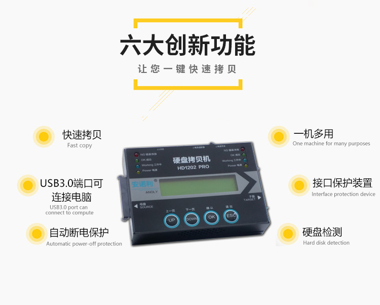 9. 智能断电设计,拷贝完成后自动断电,确保硬盘安全,避免硬盘损坏