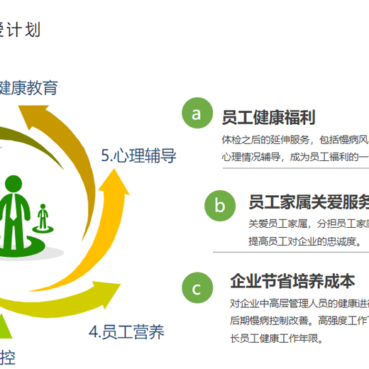 1.向员工提供有效的健康管理计划,提升员工健康素养,降低企业成本。