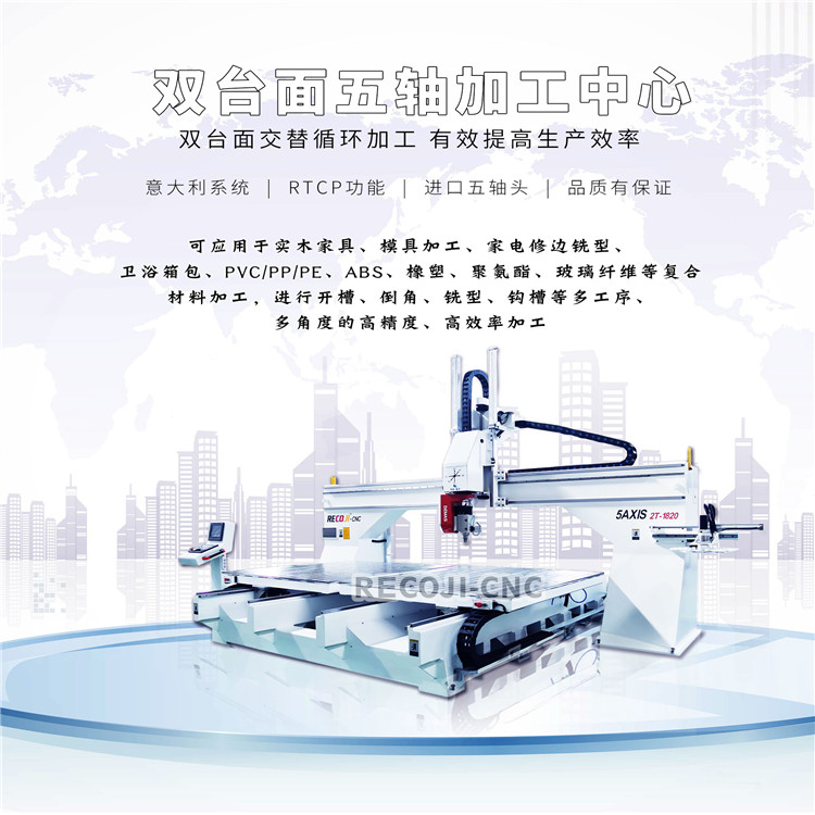 固定横梁和移动工作台面的设计,加上结构刚性高与平稳的加工的台面,使5轴机在加工方式时可以保持一个高速的状态,是用来处理高速修边、开槽、钻薄的硬质材料,如热成型塑料等。此机械之切削移动是以工业标准G码控制,并支持市面上一般的CAD/CAM软件及工业用3D模组的软件。其他选项包括工件尺寸探测,单、双区功能,并根据要求订制配置。