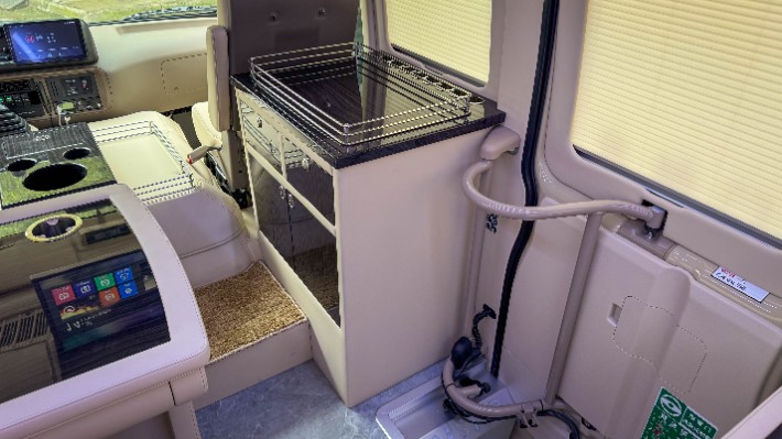 西安考斯特销售改装公司 一起来看看它的前方内饰,豪华的情况下呢,它前方配置也是非常的,像上方的吸顶电视呢,支持联网,平时我们在车内可以看看新闻,冰箱水壶都是给你配备的,车内乘坐的人数多呢,赶上雨天,我们车内也配备了6把的雨伞,像领导的位置呢,还配有一个专属的办公桌,我们在上方可以喝茶呀,或者是办办公,手机的无线充电器,杯托,纸巾盒全给你配备了,使用起来也是非常的方便。