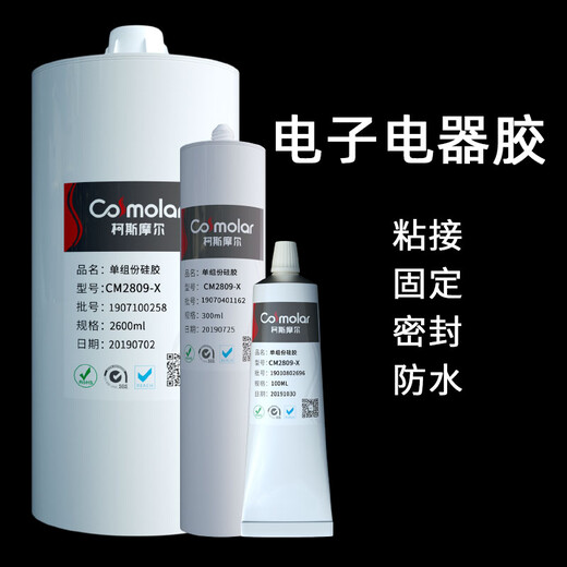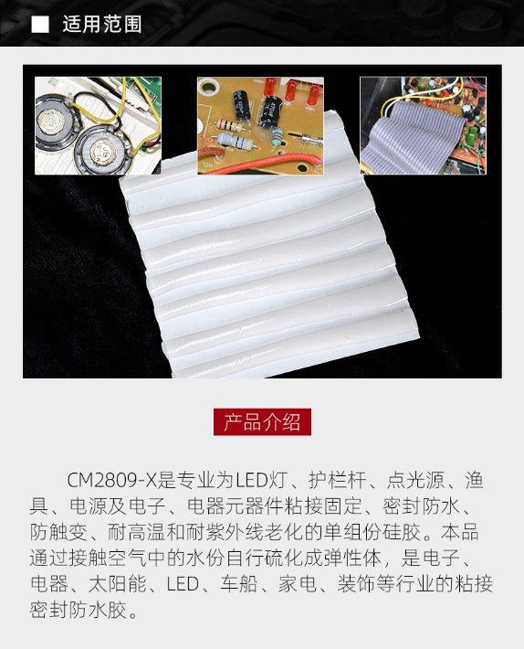 CM2809-X是为LED灯、护栏杆、点光源、渔具、电源及电子、电器元器件粘接固定、密封防水、 防触变、耐高温和耐紫外线老化的单组份硅胶。本品通过接触空气中的水份自行硫化成弹性体,是电子、电器、太阳能、LED、车船、家电、装饰等行业的粘接密封防水胶。