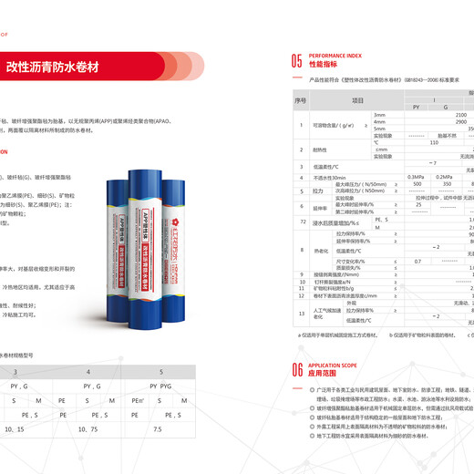 本产品是以聚酯毡、玻纤毡、玻纤增强聚酯毡为胎基, 以无规聚丙烯(APP) 或聚烯烃类聚合物(A PAO、APO等) 做石油沥青改性剂, 两面覆以隔离材料所制成的防水卷材。