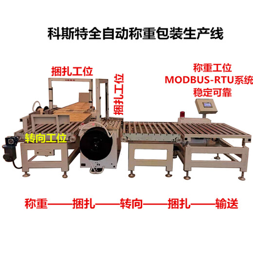 产品称重后大于或小于标准重量后报警剔除,在标准范围内进入前捆扎捆扎完毕后再进入转向随之进入后捆扎