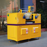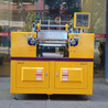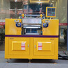 开炼机工作时,两辊筒相向旋转且速度不等,堆放在辊筒上方的物料由于辊筒表面的摩擦和粘附作用,以及物料之间的粘结力而被拉入辊隙之内,在辊隙内受到强烈的剪切与挤压,使其产生形变,从而增加各组分之间的界面,产生了分布混合,该剪切亦使物料受到大的应力,当应力大于物料的许用应力时,物料就会分散开来,在通过辊隙时,料层变薄且包裹在较高温度的辊筒表面,加上承受剪切时产生的热量,物料即渐趋熔融或软化,此过程反复进行,达到预期的熔融塑化和混合状态,完成炼塑。