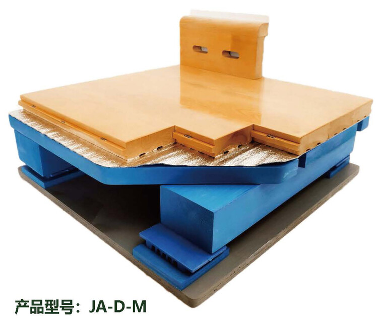 3、木地板系统和地面的固定方式采用悬浮式铺装,龙骨与地面不连接固定,使整个地板系统在体育运动状态下不受任何束缚,发挥自然弹性,这是世界上的铺装方法。其优点在于不破坏地面,防止地下潮气影响木地板;地板弹性好,特别是能够充分满足德国DIN18032-2标准要求的三大功能和六项运动性能指标。传统的木龙骨和水泥地面连接方法采用在地面上打孔埋膨胀螺栓,用铁丝捆绑龙骨,破坏了地面的防潮层,潮气可直接影响木地板系统,使木地板的寿命大大减小,而且严重影响整个地板系统的弹性。