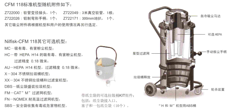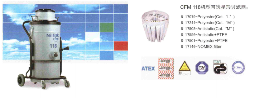 www.cfm-china.com.cn上海布劳得自动化科技有限公司负是韩国CHCA集团在大中华区域的全资直属销售代理公司,代理全国各地区除尘设备(粉尘防爆安全型除尘器、除味除尘器、除烟除尘器、湿式除尘器、干式除尘器、油雾净化除尘器)的销售和售后服务工作,我们相信您购买我们的产品不是一笔买卖的结束,而是我们长期合作的开始! Nilfisk-CFM 118 单相小型工业吸尘机特点: 1,单相小型机中小,轻型,灵活实用 2,脚轮的增加,使垃圾桶移出更加方便;垃圾桶容易提升和携带;垃圾桶容易倾倒而不费力3, 垃圾桶上还可以选装纸尘袋收尘装置,即,在垃圾桶上安装一个纸尘袋接入口和一个活动的塞子,当选择纸尘袋收集垃圾时,将塞子塞入机器的吸入口处,将吸入口封堵上,以不改变机器的真空性能,此时的吸入口使用垃圾桶上的纸尘袋接入口即可。 4,不锈钢容器和HEPA过滤器机型选择,同时也有带ABS处理有毒粉尘机型 5,多种过滤网可供选择, ①标准聚酯过滤网 ②细微粉尘的特氟纶过滤网 ③耐温高达240°的耐高温过滤网 ④HEPA过滤器,过滤达99.999%,过滤精度达0.3徽米 ⑤星形过滤网:8 17079-Polyester(Cat.”L”) 涤纶、聚脂纤维 8 17244-Polyester(Cat.”M”) 涤纶、聚脂纤维 8 17508-Antistatic(Cat.”M”) 防静电、抗静电 8 17556-Antistatic+PTFE 防静电+净化过滤膜 8 17501-Polyester+PTFE 涤纶、聚脂纤维+净化过滤膜 8 17146-NOMEX filter 绝缘纸+滤器 6,随机附件: Z722000:软管变径接头,1个 Z722049: 3米 真空软管,1根; Z 722026:铝制弯形手柄,1个; Z722171: 300mm 地扒,1个 7,Nilfisk-CFM 118其它可供选机型: ① MC-吸有毒、有害粉尘机型; ② AU-HEPA机型,过滤精度0.3微米; ③ HC-带HEPA的吸有毒、有害粉尘机型,过滤精度0.3微米; ④ X-304不锈钢垃圾桶机型; ⑤ XX-304不锈钢垃圾桶和过滤室机型; ⑥ DBS-纸尘袋盛装垃圾机型; ⑦ FM-CAT“M”过滤网机型; ⑧ FN-NOMEX耐高温过滤网机型; ⑨ SBS-安全袋收集有毒或危害物机型 ■价格说明■ 一般情况下:1.网页价格:网页所指示的价格可能是商品的销售指导价或该商品的曾经展示过的销售价等,并非实时报价,仅供参考。 2.商品规格配置:商品页面所提供的规格配置因性能改善随时会有变更,恕不另行通知,如需获取准备的规格配置及报价可致电我司获取新实时报价单。 3.本产品质保期为一年(注:耗材以及人为损坏的除外)。质保期满后终身有偿维修! |