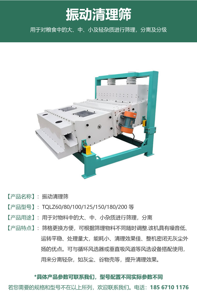 TQLz型振动筛主要用于对粮食中的大、中、小及轻杂物进行筛理、分离。其特的分断匀料机构可确保物料均匀进入筛面。可连接TFDZ无动力垂直吸风道或TFXH系列循环风选器。被广泛用于碾米、制粉、油料加工、饲料、食品和化工等行业的颗粒料分离。