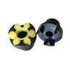 LM型梅花联轴器是由两个带凸爪形状相同的半联轴器和弹性元件组成,利用梅花形弹性元件置于两半联轴器凸爪之间,以实现两半联轴器的联接。两半联轴器的结构尺寸相同,其端面各有若干个凸爪,依次嵌入梅花形弹性元件的圆形凸部之间。并通过他们之间的接触将扭矩从主动轴传至从动轴。弹性元件的材料有聚氨酯和铸形尼龙两种。根据不同工况条件选用不同材料,如风机、水泵、轻工、纺织等作平稳、载荷变化不大时,可选用聚氨酯。目前大都采用的弹性体为聚氨酯。本联轴器广泛使用于水泵、油泵、机床等行业。换弹性元件时两半联轴器需要沿着轴向移动才能达到换弹性元件的目的。所联两轴的许用相对位移,除与尺寸大小有关外,还与弹性元件工作部分的形状有关,对于与炬形凸爪接触的梅花形弹性元件,许用径向位移△y为0.2mm,角位移△a为1.5°,对于与圆弧形凸爪接触的梅花形弹性元件,许用径向位移△y为0.5~1.8mm,许用轴l向位移△x为2~5.0mm,许用角位移△a为1.0°~2.0°。当工作需要提高补偿性能,而对承载能力允许稍有降低时,亦可制成沿轴向为鼓形的梅花形弹性元件,或将两半联轴器的凸爪制成中凸形式,还有矩形和长弧形凸部等几种。梅花形弹性元件的材料除了橡胶外,还有用工程塑料如聚氨醋弹性体等制成的。弹性元件在单向转动时,只有一半的凸部承受载荷,起着传递扭矩的作用。参与传递扭矩凸爪接触面上的载荷分布情况与接触部分的形状有关,以粗形凸爪接触而为例,如不考虑其他影响,可以认为载荷按梯形规律分布。随着内外直径的差值增加,载荷分布的不均匀性也随之增加。此外,当两半联轴器有相对位移,弹性元件的工作面与半联轴器凸爪之间存在间隙时,这种载荷分布的不均匀性还将进一步增加,不但一个凸爪工作面上的载荷分布不均匀,而且各受载凸爪之间的载荷也趋向不均匀。采用随弧形的接触面可以改善工作面上载荷分布的不均匀性。因此能传递较大的扭矩,但它的弹性稍有降低。